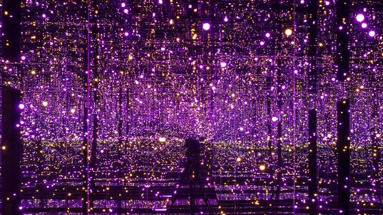 Now envision this: you are in a room with only mirrors, instead of walls, you are in a seemingly infinite room with infinite reflections of yourself. Now imagine beautiful purple fairy lights, hanging all over the room. The dark corners now reflect purple light back at you. They look like purple stars and it seems like you are in your own purple-starred universe. This is one of Yayo Kusama’s most famous installations: the infinity mirror rooms.