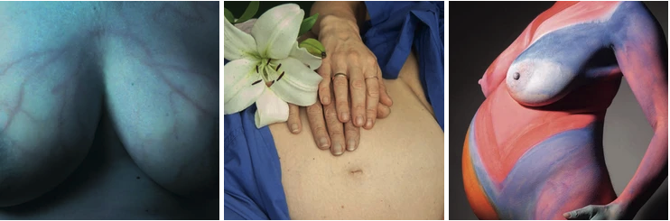 Aesthetically breathtaking, Alina’s capturing of motherhood commemorates – rather than conceals – the sumptuousness of the body and its changing form. She highlights the physical and emotional vicissitude of pregnancy and birth and aligns a woman’s sexual agency with their role as a channel for human life. There is intimacy, serenity, connection and peace within her shots, showcased further by the metaphorical use of botanical life. This, combined with Alina’s sensitivity to textures and use of a colour palette that shifts from deep, fluorescent blues and greens to glowing pinks harmonises the body and flora as one.