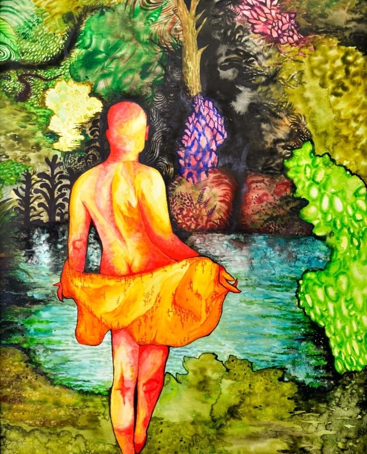 Ripley: I am a painter and a writer based in Hackney and East London, [originally] from Northumberland. My practice is predominantly large scale watercolour paintings that are based on folklore and queer anthropology research, which is the performance basis of my writing. I write research texts and poetry, and my work is informed by inquiry based studies of folk culture, particularly looking at genderqueer and homoerotic characters and narratives from ancient stories.