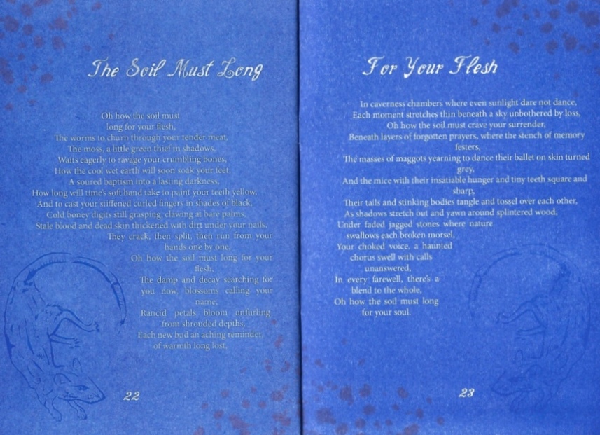 To be honest, I was much like the audience would be, an observer and a very appreciative one at that. I wouldn’t say, gave them encouragement, because they’re confident within their work, but I gave them a sort of presence within their work. And then we came to the main part, putting the booklet and the anthology together. There’s a poem about me in there that I love, and it’s actually the first poem that anyone has written about me, ‘Our Lady of Song’. We sat endless nights on this settee that we’re sitting on right now doing the anthology. So, it’s really nice to officiate this creative partnership between me and Ripley, I hope we will go on for many years to come!