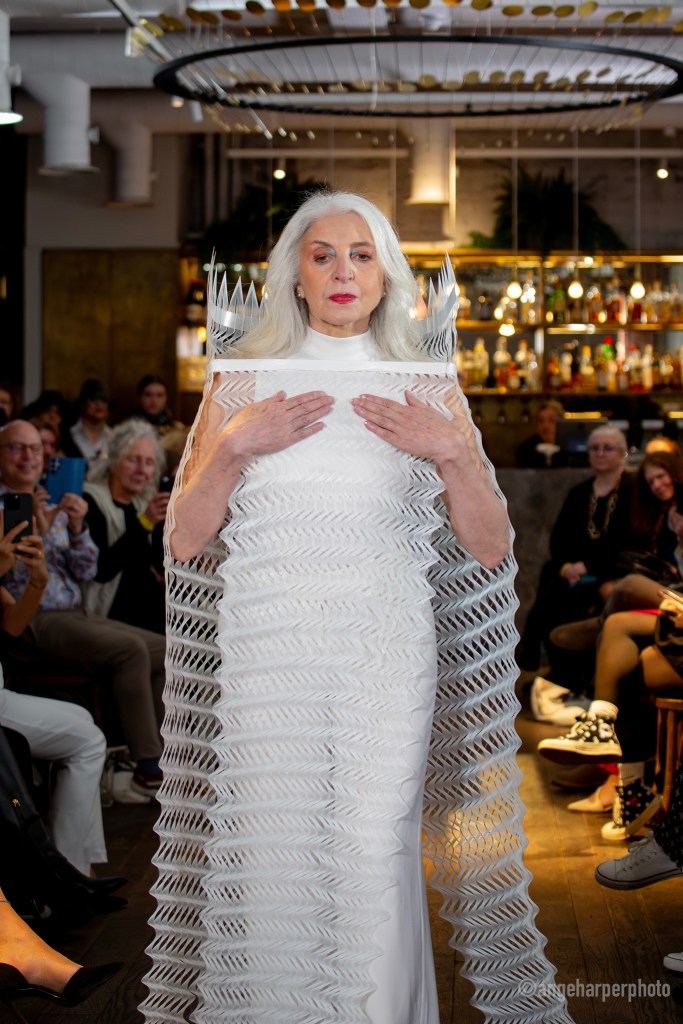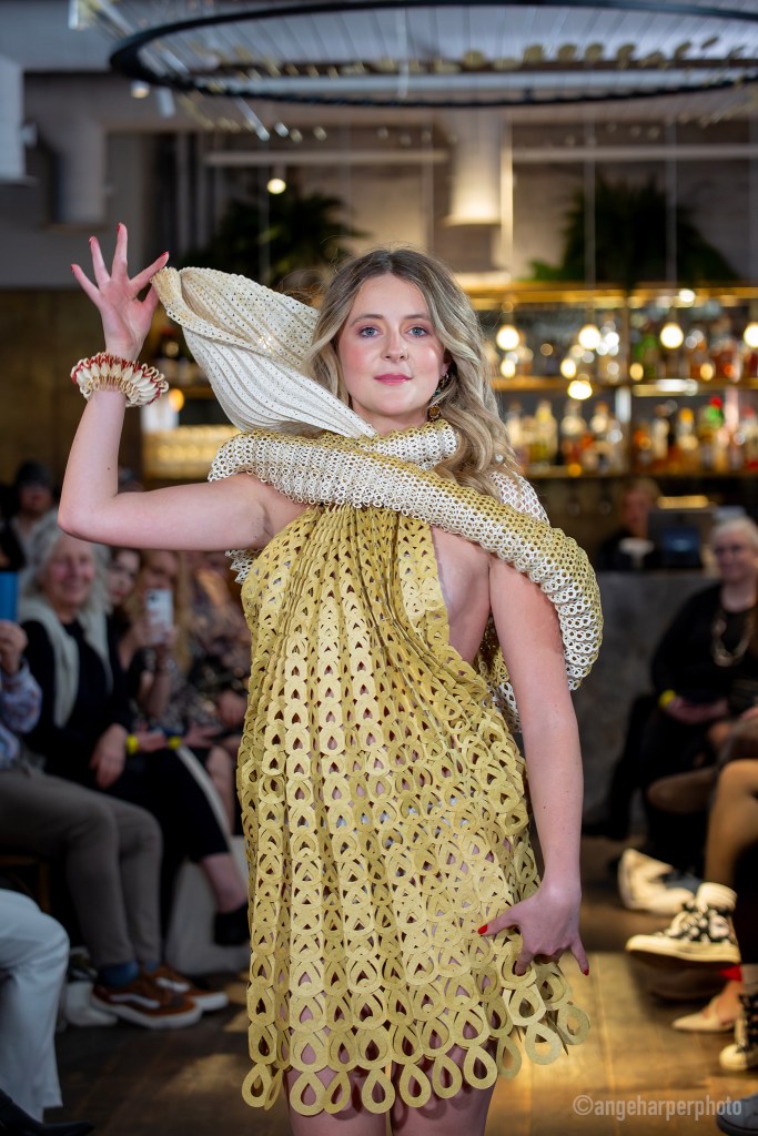 Featured on the catwalk were also Arcas Bear, Recondition, Ripple (Darryl Bedford and Gareth Volka collaboration) and Kat Paylor Bent of Seated Sewing, the latter of whom includes braille on all her clothing, made of tiny Swarovski Crystals.
