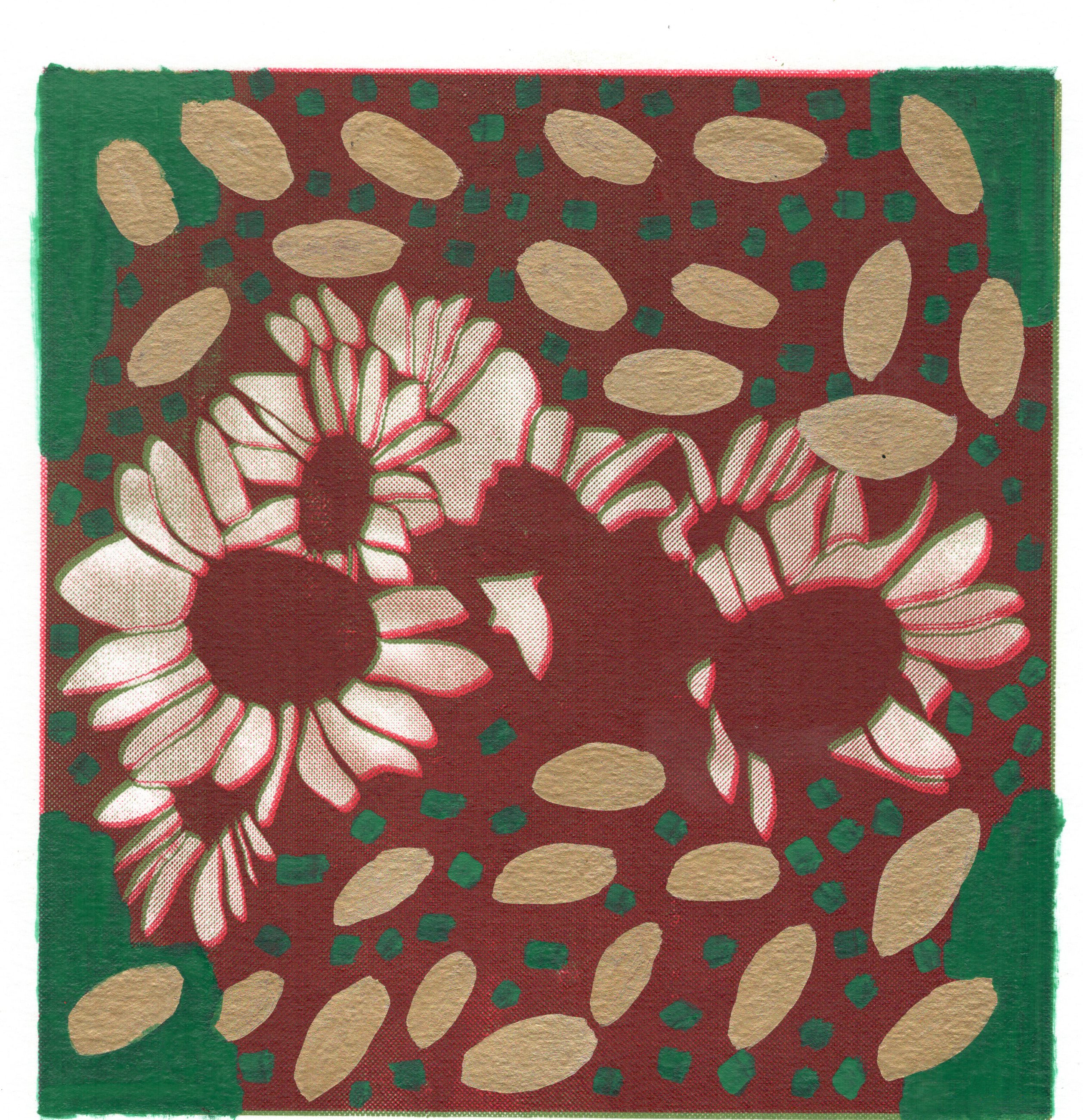 One standout is his Flowers series. Created through screen printing, the delicate silhouettes are then enhanced with hand-drawn details, done using Liquitex acrylic markers, giving the figures an unexpected sense of movement and emotional depth.