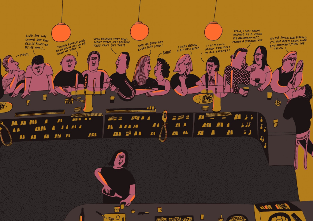 By capturing what’s happening behind the bar, the illustrator Edie Medley sheds light on universal conversations and the pub’s role in our social dynamic.