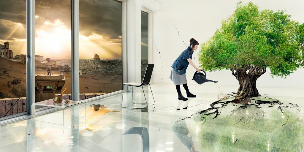 Her relationship with representing her birthplace has evolved dramatically over the past two decades. Early on, in Bethlehem Bandolero (2005), “the humour and Western tropes let me wrestle with identity and tragedy in a playful way, countering expectations of solemnity.” Over time, her vision has evolved into a dystopian landscape. In In Vitro, she begins with familiar symbols, such as the Church of the Nativity, and dismantles them as part of a wider climate-apocalypse logic. “So the work shifts from playful critique to immersed speculation,” she reflects. “Both approaches are about transformation—Bethlehem becomes a site of metaphor, memory and futurity.”