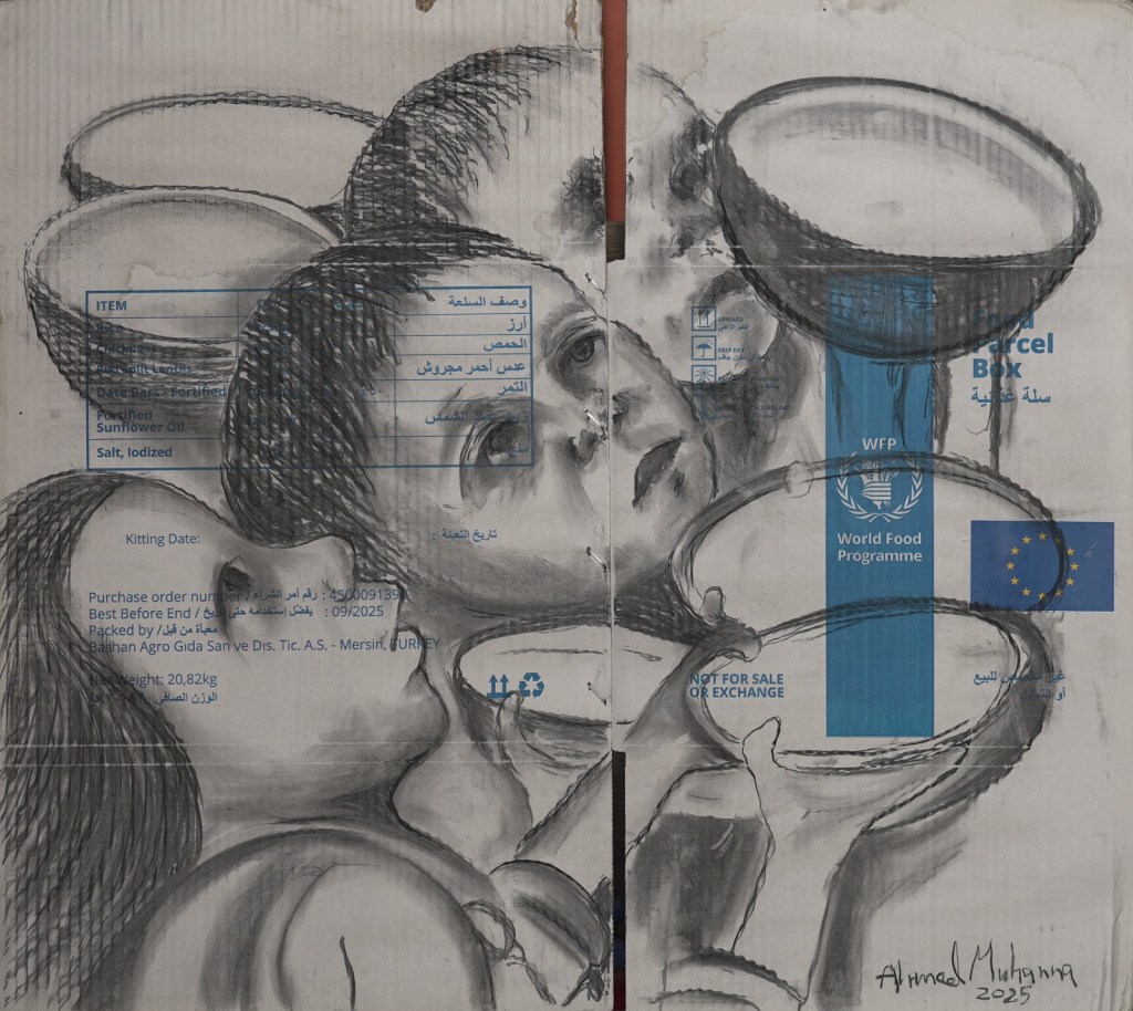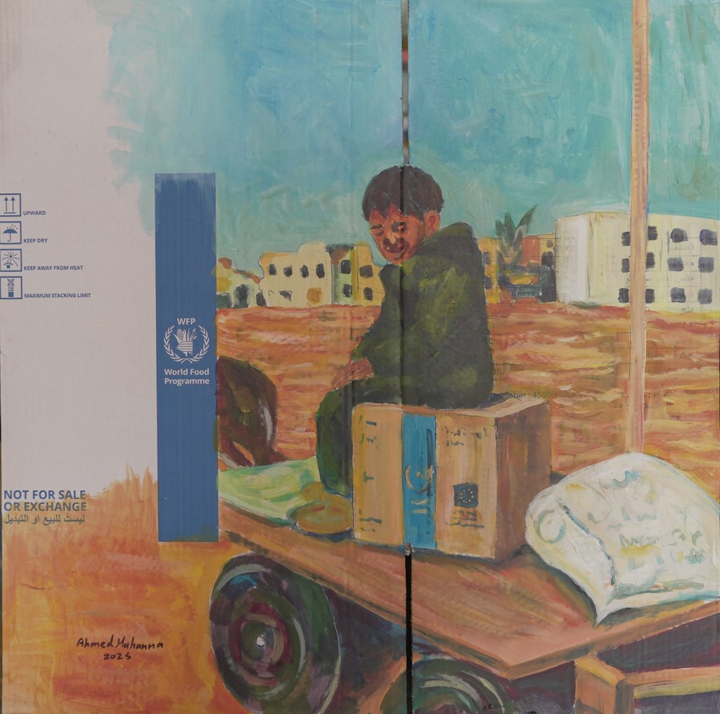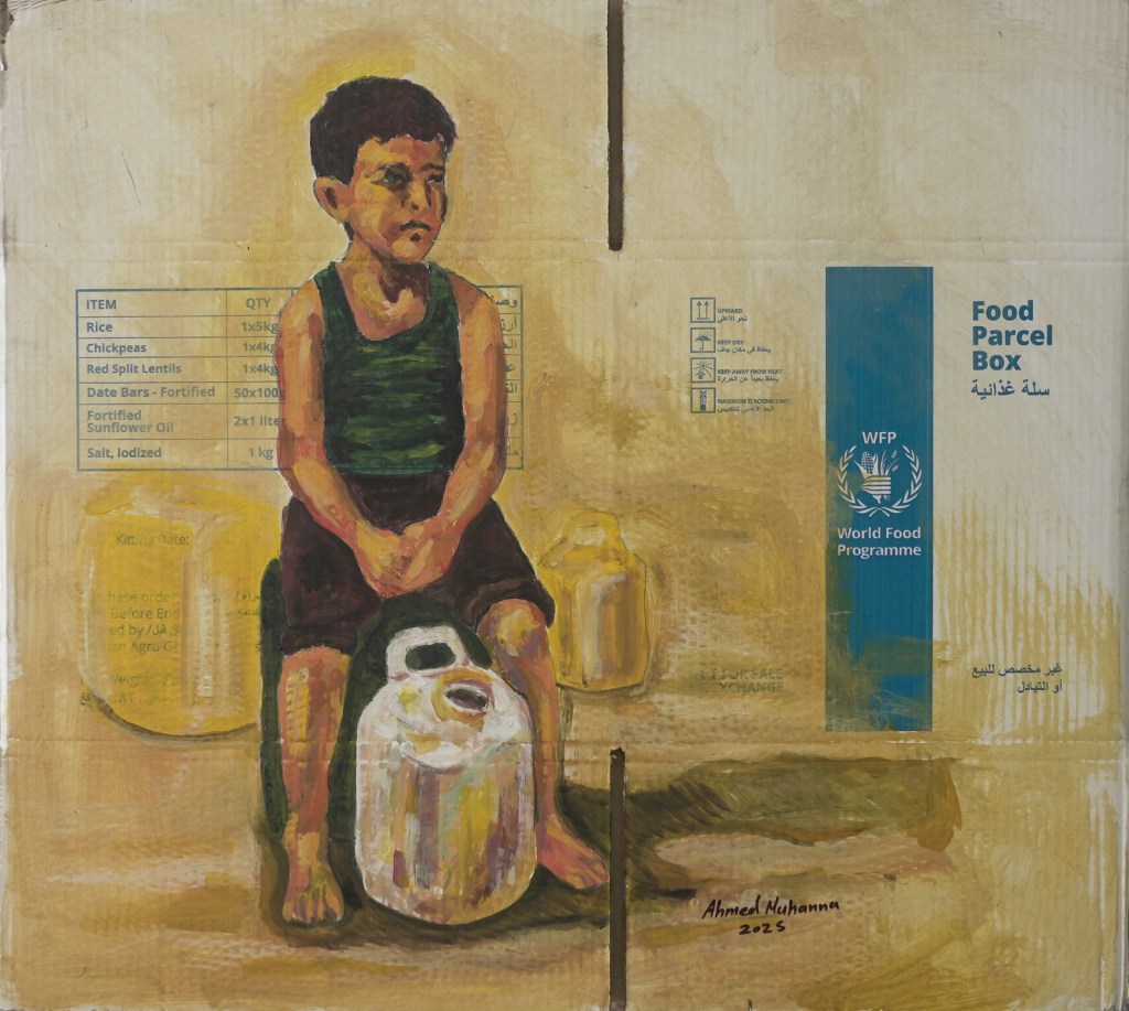 When art supplies became unavailable under siege, Ahmed began transforming those same aid containers—the cardboard vessels that had carried food to displaced families. He immortalised the children’s stories that needed to be told: small faces carrying water jugs, fathers holding lifeless bodies, the endless queues for survival.