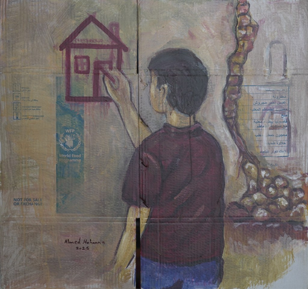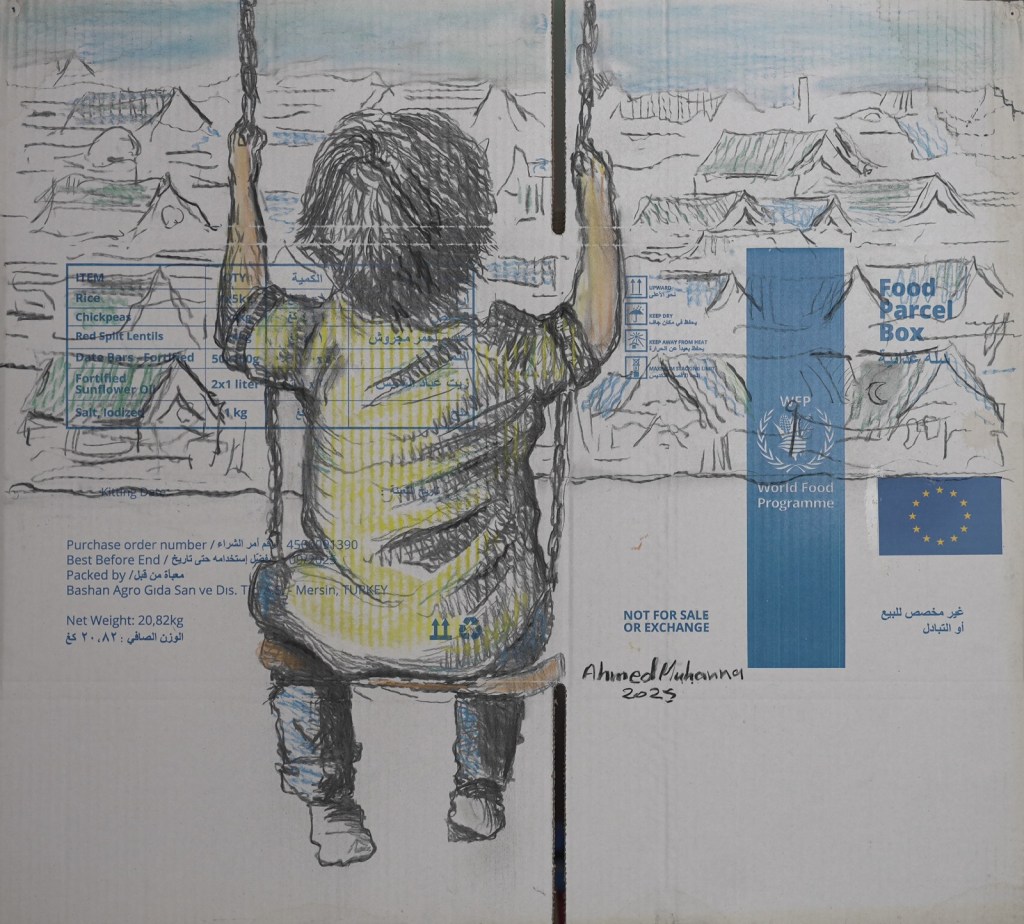 Just as Zeina could not disconnect from that radio report—those devastating words echoing in her mind until she felt compelled to write—Ahmed found himself surrounded by the cardboard remnants of survival. The WFP aid containers that sustained his community became impossible to ignore, each empty vessel a testament to hunger, exile, and the relentless machinery of need.