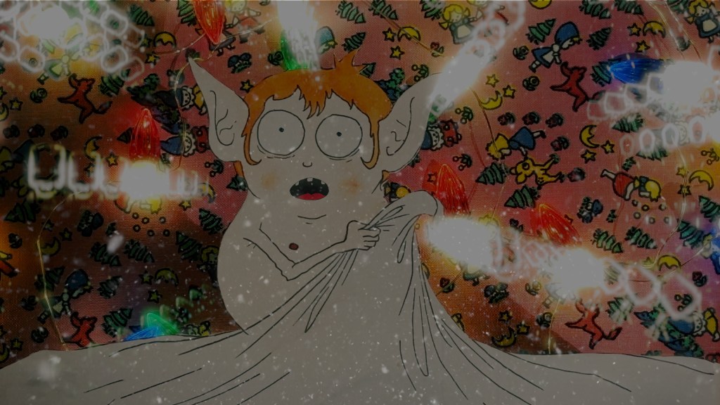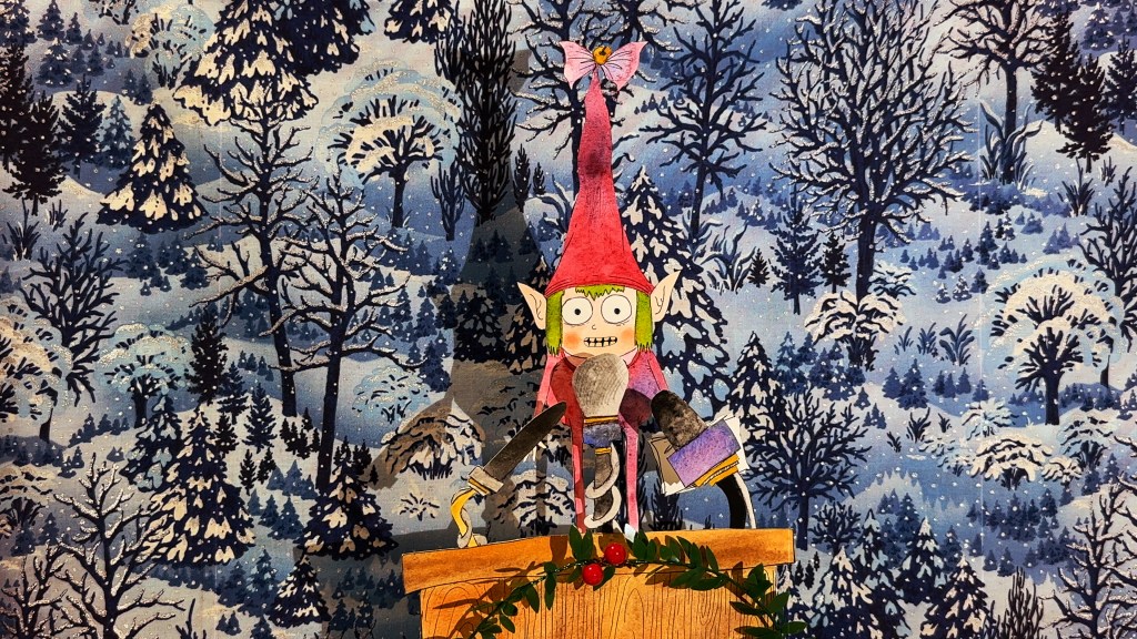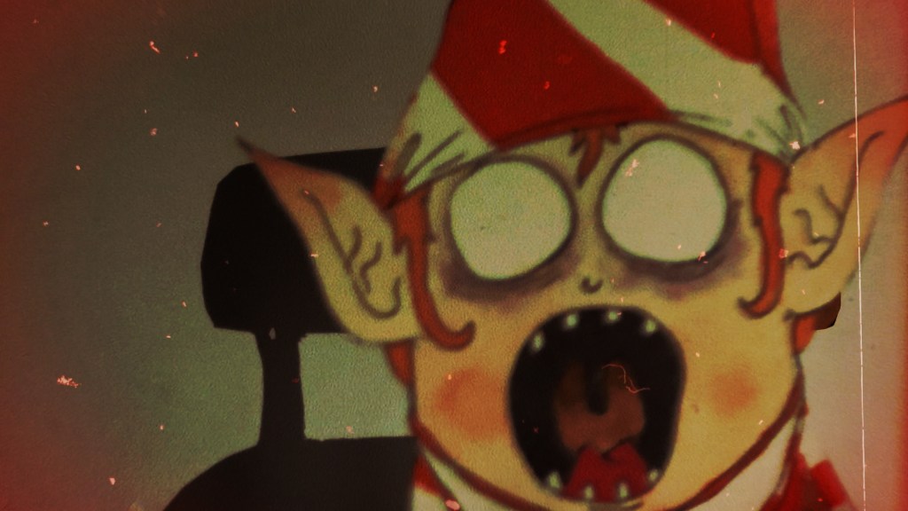 I think of the gingerbread-man screaming, the elf wrapping empty boxes, the gingerbread-policeman entering the killer’s mind with no resolution. Each image opens enough to contain multiple truths. Political satire, yes, but also personal grief. Childhood terror and adult recognition. The sacred and the profane existing in the same frame.