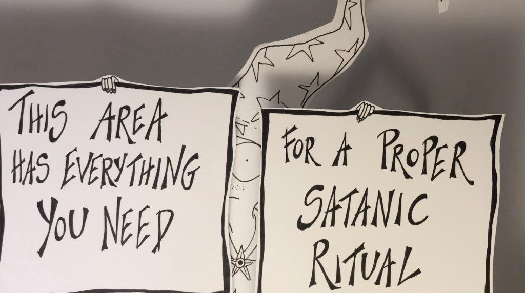 His short film, The Little Broomstick Rider works the same way. A nine-year-old cheerfully admitting to witchcraft. A child’s trial. Childlike form carrying the heavy weight of historical witch hunts, of real violence against real people.