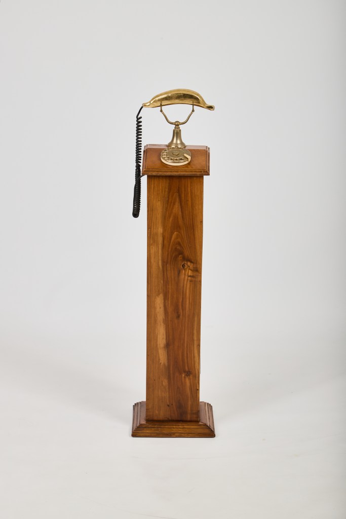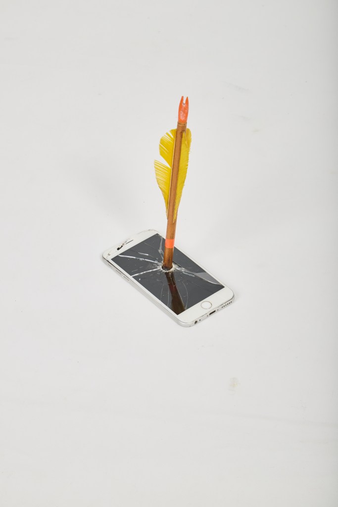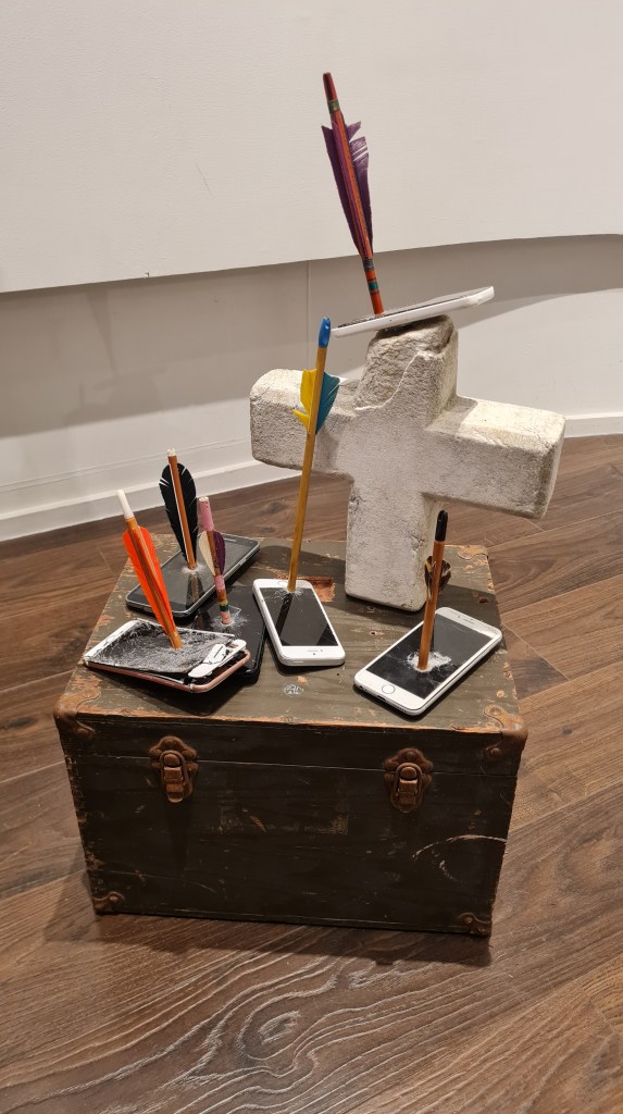 Dotted throughout the exhibition are some of the 42 sculptures named Phone Down (2025/2026). They are shattered smart phones, their destruction a process Nicholas enjoyed immensely. His disdain for our dependency on digital technologies, especially smart phones and tablets is unmistakable. “I hate it when people say that curiosity killed the cat. No, curiosity didn’t turn us into fascists! What actually kills us is convenience. Convenience made the cat fat, lazy and have a heart attack. And smart phones are just that: Convenience.”