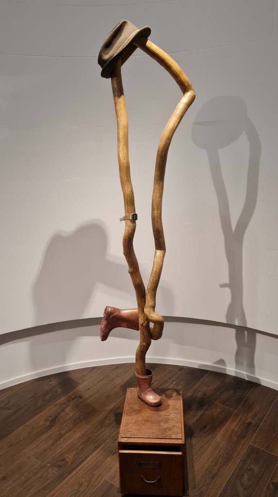 His childhood and adoration of his parents run through everything. Mum (2025) is an installation featuring an intertwined piece of ivy standing in golden infant wellington boots and topped with “Pete Doherty’s hat, which he lost [in his heydays] after the infamous Baby Shambles Riot in 2004”. Here, Nicholas has captured his mother’s carefree and hedonistic life before she had children. As a proud father to his six-month-old son, he honours this transition from youthful freedom to parental responsibility.