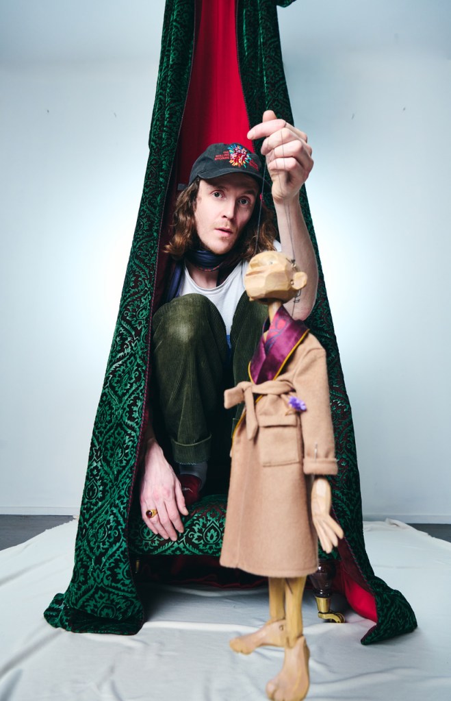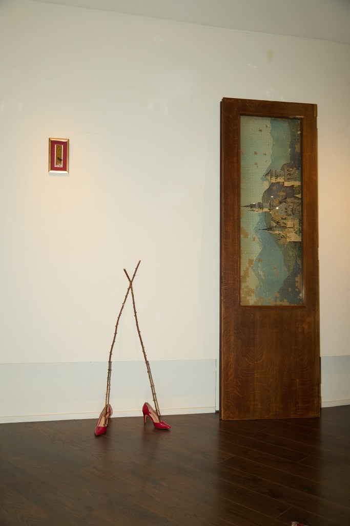 A few metres along the wall, I spot two thorny sticks propped up in red high-heeled shoes, called Fashion Legs (2025). Nearby the prickly statue is a tall door that Nicholas has taken from the apartment building of his student flat in Antwerp, Belgium, where he studied fashion, design and art at the Royal Academy of Fine Arts while his father was already ill. “Every time I went home, my dad was skinnier, frailer, less able to do gardening, less able to do the things he loved. And it really messed me up. I was really unwell.” He made the piece in 2018, incorporating a giant puzzle of the iconic German castle Neuschwanstein where a wooden panel or glass may have been beforehand. In a characteristic twist, the artwork combines two things Nicholas is not particularly fond of: Puzzles and the “tyranny of a predetermined outcome”, eliminating the process of creative play.
