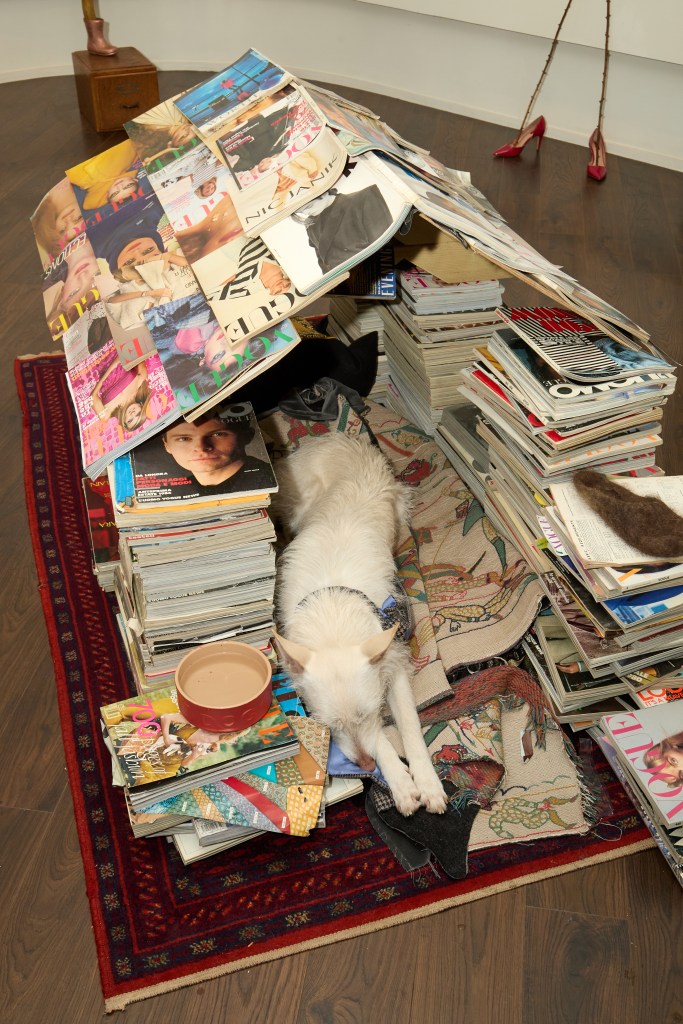 What strikes me most as I take in the exhibition is the relaxed and familial atmosphere as we move from sculpture to sculpture, dinner jacket to evening robe, whilst Wilfrid Wright, curator and friend of Nicholas, tells us the story behind every item. To my delight, I’m allowed to touch the extraordinary jackets, robes and gowns, each handcrafted and finished to perfection. I marvel over a piece called Slow and Steady (2025), a French snail shell perched on a sewing machine foot he once found close to his father’s old workstation, and take pictures of a dog house built from old Vogue magazines. Nicholas’ lurcher Lottie now snoozes soundly on a dog bed made from black and silver offcuts of cloth, having tired from roaming the groups of visitors. Nicholas tells me that he used to build a den for himself as a child out of those same magazines whilst his father was working in his atelier.