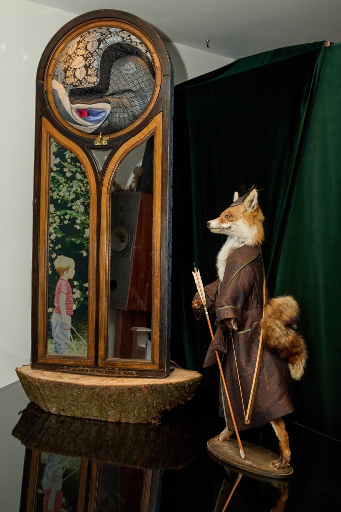 The first thing I see when I walk through the door is Foxhood (2023), an antique taxidermy fox dressed in a miniature Hanson gown and Robin Hood hat— a self-portrait of the artist and nod to his late father. On its significance as an act of rebellion of the current status quo of politics and society, Nicholas simply says: “You know, I don’t run down the street telling everyone I’m going to save the world. I just make a sculpture of Robin Hood wearing a dressing gown that hopefully will make people think about saving the world.”